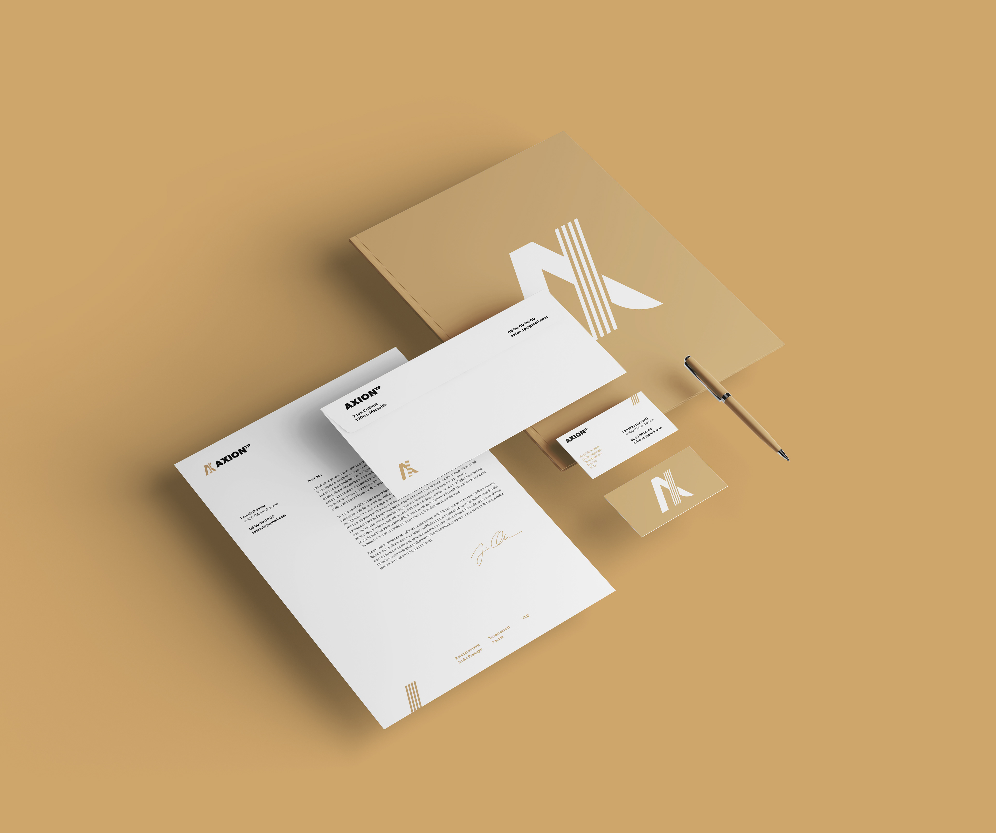 Le pragmatisme de son activité nous a inspiré un logo simple prenant la forme d’un monogramme des lettres A et X. Le A rappelle le bras d’une pelle mécanique tandis que le fut ascendant du X est composé de barres parallèles évoquant directement le métier (VRD, tranchées creusées, traces laissées par les différents véhicules…).